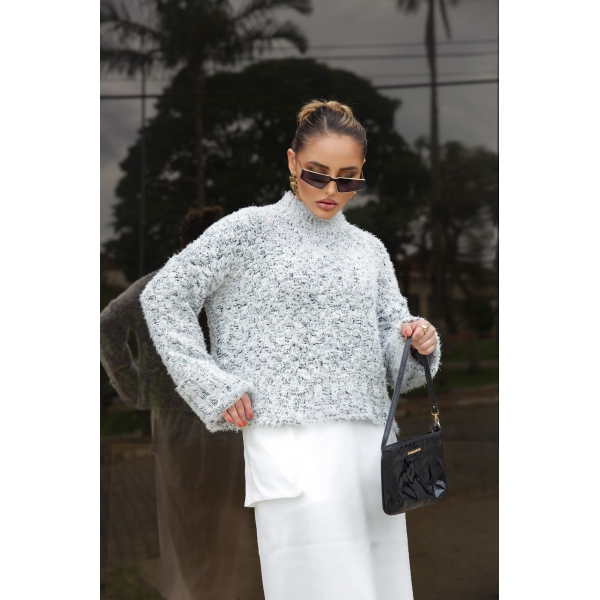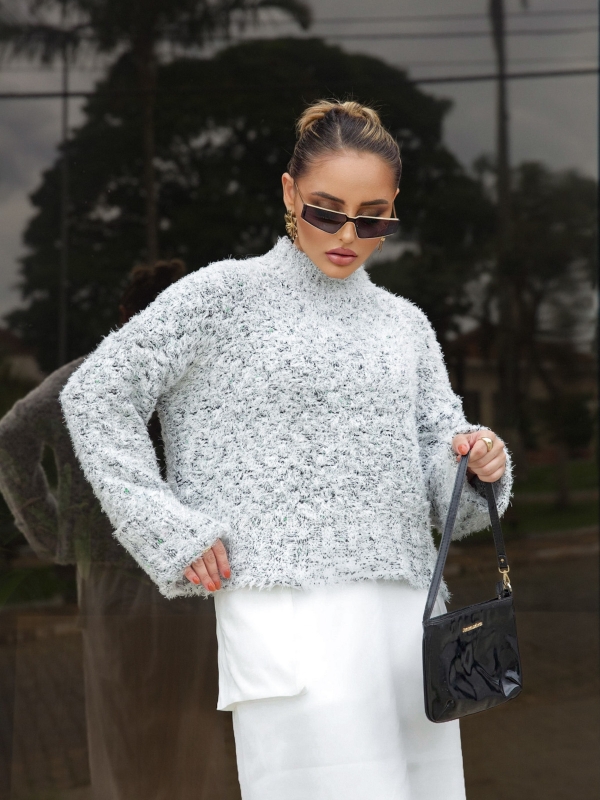 Tricot com mix de fios. Modelo ideal para deixar o look sofisticado, sem perder o conforto e aconchego da malha retilínea.